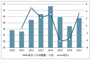 2010-2017年我國(guó)豬肉人均消費(fèi)量統(tǒng)計(jì)及增長(zhǎng)情況(單位:千克、%)
