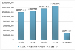 2016年我國注射器,不論是否裝有針頭進出口貿易總量13507637573個 ,2017年進出口貿易總量14741524715個 ;2018年1季度進出口貿易總量3084754228個 。