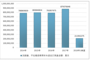 2016年我國注射器,不論是否裝有針頭進出口貿易總額792857675美元,2017年進出口貿易總額879376648美元;2018年1季度進出口貿易總額211942275美元。
