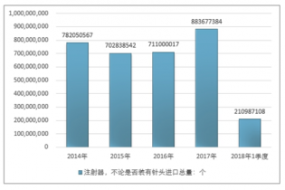 2016年我國注射器,不論是否裝有針頭進口總量711000017個 ,2017年進口總量883677384個 ;2018年1季度進口總量210987108個 。