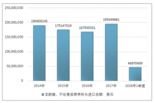 2016年我國注射器,不論是否裝有針頭進口總額167935531美元,2017年進口總額195549681美元;2018年1季度進口總額46970499美元。