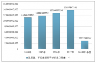 2016年我國注射器,不論是否裝有針頭出口總量12796637556個 ,2017年出口總量13857847331個 ;2018年1季度出口總量2873767120個 。