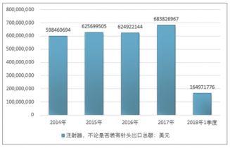 2016年我國注射器,不論是否裝有針頭出口總額624922144美元,2017年出口總額683826967美元;2018年1季度出口總額164971776美元。