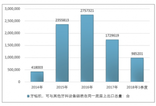 2016年我國牙鉆機(jī),可與其他牙科設(shè)備組裝在同一底座上出口總量2757321臺(tái) ,2017年出口總量1729619臺(tái) ;2018年1季度出口總量985201臺(tái) 。