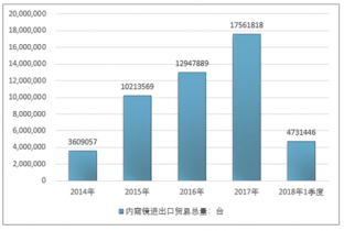 2016年我國(guó)內(nèi)窺鏡進(jìn)出口貿(mào)易總量12947889臺(tái) ,2017年進(jìn)出口貿(mào)易總量17561818臺(tái) ;2018年1季度進(jìn)出口貿(mào)易總量4731446臺(tái) 。