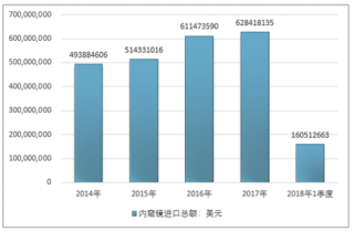 2016年我國(guó)內(nèi)窺鏡進(jìn)口總額611473590美元,2017年進(jìn)口總額628418135美元;2018年1季度進(jìn)口總額160512663美元。
