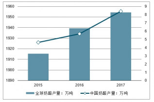 2015-2017年全球及中國(guó)奶酪產(chǎn)量情況