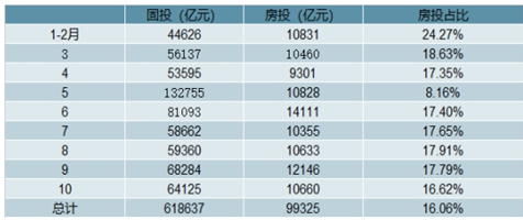 2019年1-10月份,全國房地產(chǎn)開發(fā)投資額99325億元,占固定資產(chǎn)投資16.06%,同比增長9.7%,增速較1-9月份回落0.2個百分點。其中,住宅投資70370億元,增長13.7%,增速回落0.3個百分點。住宅投資占房地產(chǎn)開發(fā)投資的比重為70.8%。房地產(chǎn)投資除6月份明顯較高(14111億元),各月份基本穩(wěn)定,在上下浮動中保持平穩(wěn)。
