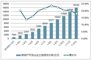 2018年1-12月中國房地產(chǎn)開發(fā)企業(yè)土地成交價款及增長情況