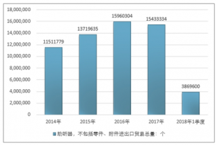 2016年我國助聽器,不包括零件、附件進出口貿(mào)易總量15960304個,2017年進出口貿(mào)易總量15433334個;2018年1季度進出口貿(mào)易總量3869600個。