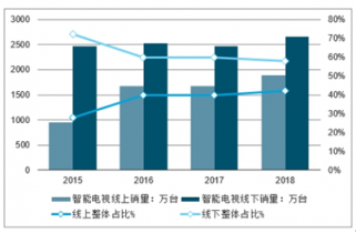 2015-2018年中國智能電視線上、線下年度銷量情況