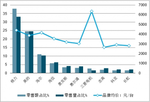 從線上電商市場零售額占比來看,奧克斯、美的、格力分別零售額占比均超20%位居前三,但是格力零售量則不足20%。從價格來看,奧克斯、美的均價比格力少。線上市場價格戰(zhàn)是主要的,從整體品牌均價來看,格力最高。從零售價格提升來看,海爾均價3283元,同比提升13.8%;其次是揚子,同比提升10.5%;松下和美的提價分別為9.9%、8.9%。
