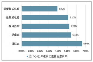 根據(jù)目前我國集成電路以及智能電子設(shè)備的發(fā)展情況來看,持續(xù)到2020年,模擬電路下游應(yīng)用中通訊模擬芯片和汽車電子將呈現(xiàn)最快年復(fù)合增長率,分別為7.4%和7.0%。模擬電路整體市場規(guī)模2017年到2022年將呈現(xiàn)6.6%的年復(fù)合增長率,高于集成電路5.1%的年復(fù)合增長率水平。