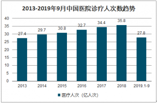 全國醫(yī)院數(shù)量持續(xù)增長,2013年醫(yī)院24709個(gè),2017年突破3萬個(gè),達(dá)到31056個(gè)。截至2019年9月底,全國醫(yī)院數(shù)量增至33589個(gè),較2018年同期增加1469個(gè)。