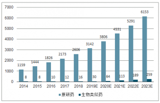 2014-2018 年我國生物藥市場規(guī)模從 1167 億元增至 2622億元,復(fù)合增長率 22.4%,增速遠(yuǎn)高于全球水平,預(yù)計 2023 年將增長至超過 6000億,而其中抗體藥物增速最快,從 2014 年的 74 億增長至 2018 年的 160 億,預(yù)計2023 年有望達(dá)到 1500 億的市場規(guī)模。