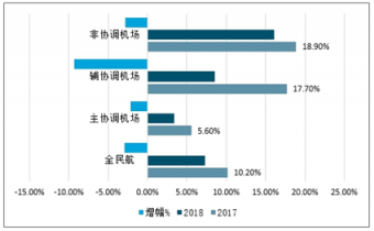 2017-2018年中國不同類型機場的定期客運航班趕回次增幅情況