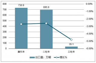 2019年全年出口摩托車730.9萬輛,比上年下降2.7%。其中,二輪車出口695.9萬輛,比上年下降2.6%;三輪車出口35.1萬輛,比上年下降4.8%。