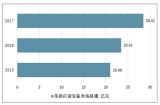 2017年,我國條碼識讀設(shè)備市場規(guī)模28.42億元,同比2016年的23.41億元增長了21.4%。