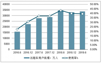 2016-2019年上半年我網(wǎng)約出租車用戶規(guī)模及使用率情況