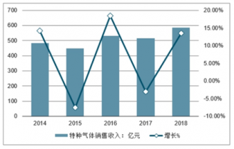 2014-2018年中國(guó)特種氣體行業(yè)銷(xiāo)售收入及增長(zhǎng)走勢(shì)