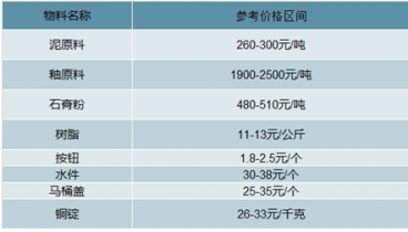 馬桶的主件是由長石、黏土、瓷石等原材料燒制而成,在制作過程中,需要使用到石膏或樹脂制成的馬桶模具。馬桶成型后對其施釉,釉是由瓷石、長石、石灰和水等攪渾而成的液體。在這兩步過程中,還需要使用到注塑機(jī)、窯爐等中間體設(shè)備,然后,組裝上馬桶蓋、水件以及其他相關(guān)產(chǎn)品即能成型。因此,整個生產(chǎn)過程中,馬桶的物料主要包括:長石、白黏土、瓷石、石灰、石膏粉、樹脂等主料,馬桶蓋、水件、銅錠、按鈕等附件,窯爐、高壓成型機(jī)、注塑機(jī)等設(shè)備。