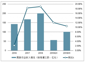 2016-2019年上半年中國(guó)男裝行業(yè)收入情況(除海瀾之家,億元)