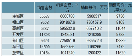 商品住宅方面,牟平區(qū)供求量最高、成交均價(jià)(7472元/平)最低。萊山區(qū)成交均價(jià)最高(12889元/平)。