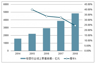 2014-2018年中國(guó)母嬰行業(yè)線(xiàn)上零售規(guī)模及增長(zhǎng)走勢(shì)