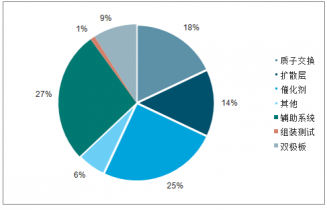 燃料電池系統(tǒng)成本:質(zhì)子交換膜、擴(kuò)散層,空氣循環(huán)系統(tǒng)成本下降空間大。從燃料電池系統(tǒng)成本構(gòu)成來(lái)看,以年產(chǎn)1000套公交車為例,電堆成本占比72%(其中:質(zhì)子交換膜27%、擴(kuò)散層19%、催化劑19%、雙極板占比5%),輔助系統(tǒng)占比27%。