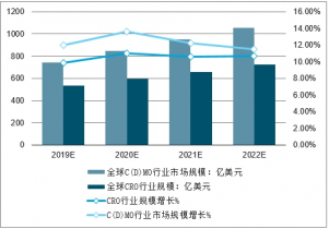圖表2019年全球生物制藥CMO市場規(guī)模及增速(單位:億美元,%)