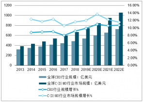 據(jù)悉,2013—2017年年均復(fù)合增長率10.3%,全球醫(yī)藥外包市場規(guī)模整體增長平穩(wěn)。2017年總體市場規(guī)模達(dá)到1041億美元,其中CRO市場規(guī)模446億美元,占43%,C(D)MO市場規(guī)模595億美元,占57%。未來5年,全球CRO+C(D)MO行業(yè)仍將保持高速增長,2022年全球醫(yī)藥外包行業(yè)規(guī)模將達(dá)1784億美元,年均復(fù)合增長率達(dá)11.4%。