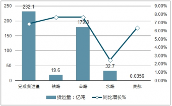 2019年上半年,完成貨運量232.1億噸,同比增長6.9%,增速較一季度加快0.6個百分點。分方式看,鐵路貨運保持較快增長,完成貨運量19.6億噸,同比增長7.7%,占全社會比重達8.4%,同比有所提高,鐵路大宗物資運輸優勢進一步發揮,煤炭增量占總增量的80%左右。公路貨運保持增長,完成貨運量179.8億噸,同比增長7.7%,高速公路貨車流量增長9.7%。水路貨運增速回升,完成貨運量32.7億噸,同比增長2.5%,增速較一季度回升2.0個百分點。民航貨運穩步增長,完成貨運量356萬噸,同比增長6.4%。快遞業務量持續高速增長,完成業務量220.8億件,同比增長27.5%。