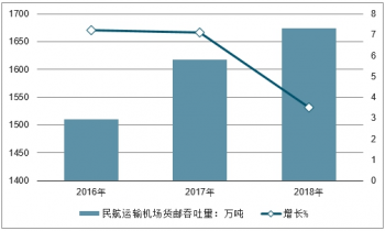 2016年我國民航運(yùn)輸機(jī)場貨郵吞吐量1510.4萬噸增長至2018年的1674.0萬噸.