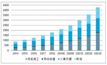 人工成本上行趨勢下,靈活用工潛力巨大。靈活用工是指企業(yè)將非核心、重復性崗位外包給服務(wù)商,由服務(wù)商組織人員完成相關(guān)業(yè)務(wù),服務(wù)商在派出人員薪酬(含社保等)基礎(chǔ)上收取15%-20%服務(wù)費。靈活用工的本質(zhì)為幫助企業(yè)解決用工彈性,減輕后臺人力資源部門壓力,規(guī)避勞動糾紛&用工風險。滲透率角度,目前國內(nèi)靈活用工人數(shù)/總體就業(yè)人數(shù)為0.17%,滲透率相比美國10%/日本4%/歐盟3%仍有較大提升空間;參考海外路徑,在經(jīng)濟趨勢不確定、人工成本上漲、用工規(guī)范趨嚴下,企業(yè)將在用工問題上精打細算,提升對靈活用工的需求。2019年我國靈活用工市場規(guī)模為592億元,14-18年CAGR為26%,18-23年預計CAGR為25%。