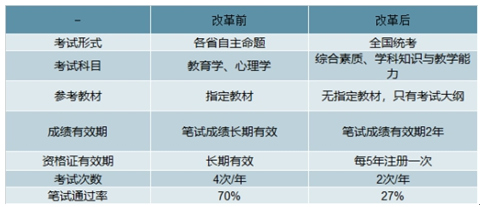 教師資格證考試改革后通過率驟降。2015年,教師資格證考試改革正式實(shí)施,打破教師終身制且五年一審,改革后實(shí)行全國(guó)統(tǒng)考,考試內(nèi)容增加、難度加大。同時(shí),改革后將不再分師范生和非師范生的區(qū)別,想要做教師都必須參加國(guó)家統(tǒng)一考試,方可申請(qǐng)教師資格證。2018年9月,教育部宣布教師資格證書由國(guó)務(wù)院教育行政部門統(tǒng)一印制,社會(huì)各類培訓(xùn)機(jī)構(gòu)頒發(fā)的培訓(xùn)證書、證明不能作為教師資格證書使用。據(jù)統(tǒng)計(jì),改革后筆試通過率僅為27%,相比改革前大幅下滑43pct。教師資格證考試難度的提高有望促使參培率進(jìn)一步提升。