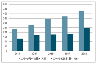 2014-2018年中國三種專利授權量、申請量走勢