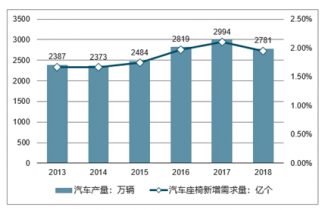 2013-2018年中國(guó)汽車產(chǎn)量及汽車座椅新增需求量情況(單位:萬輛,億個(gè))