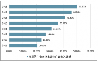 2011-2018年全球互聯(lián)網(wǎng)廣告市場占整體廣告收入比重走勢