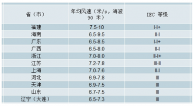 臺灣海峽海平面90米高度區(qū)域平均風速介于7.5-10米/s,部分地區(qū)年均風速超過10米/s,風場基本以IECI類或I+為主,具備極佳的開發(fā)價值。而沿臺灣海峽往北的浙江、上海、江蘇地區(qū)海域,海平面90米高度平均風速降至7-8米/s之間,浙江以及上海地區(qū)海上風場大多屬于IECII至I+類風場,而再向北部的江蘇海域大多屬于IECIII或II類。而從臺灣海峽向南的廣東、廣西區(qū)域,海平面90米高度年平均風速降至6.5-8.5米/s,這些區(qū)域海上風電場大多屬于IECI+類或II類。位于環(huán)渤海和黃海北部的遼寧、河北海域,海平面90米高度年平均風速基本介于6.5-8米/s之間,該區(qū)域的海上風電場大多屬于IECIII類