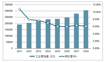 2011-2018年中國工業(yè)增加值及增速走勢