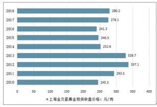 2010-2018年上海金交氫黃金現(xiàn)貨收盤價格走勢