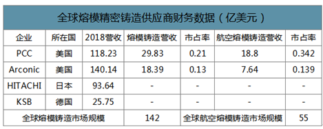 全球熔模精密鑄造供應(yīng)商財務(wù)數(shù)據(jù)(億美元)