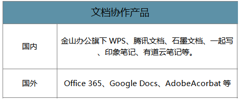 文檔協(xié)作是指對(duì)文檔、表格、幻燈片等的多人在線編輯以及云共享和云存儲(chǔ),以達(dá)到云辦公的目的。目前,我國文檔協(xié)作領(lǐng)域競爭激烈,巨頭凸顯。2019 年數(shù)據(jù),微軟 Office 辦公軟件全球用戶數(shù)超 12 億,金山 WPS Office 用戶數(shù)超 3 億,騰訊文檔活躍用戶數(shù)近 3000 萬,石墨文檔普通注冊用戶 2000 萬、企業(yè)用戶 20 萬,Google Docs 付費(fèi)用戶超過 400 萬。另外,AdobeAcrobat 作為 PDF 解決方案領(lǐng)導(dǎo)者,目前已實(shí)現(xiàn) 20 億安裝量。