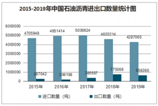 2019年1-12月中國石油瀝青進(jìn)口數(shù)量為4287065噸,同比下降6.9%;2019年1-12月中國石油瀝青進(jìn)口金額為177155萬美元,同比增長0.6%。2019年1-12月中國石油瀝青出口數(shù)量為656360噸,同比下降15.3%;2019年1-12月中國石油瀝青出口金額為29588萬美元,同比增長4.5%。