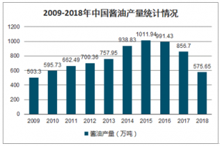 醬油是我國傳統(tǒng)調味品中市場規(guī)模最大的品類,在科學研究技術的大力支持下,我國醬油生產狀況改善得到了大量的技術支持,生產效率及產品質量穩(wěn)步提高。國家統(tǒng)計局數據顯示,2009-2015年我國醬油產量逐年增長,之后2016-2018年連續(xù)三年下降,2018年我國醬油產量為575.65萬噸,較2017年856.7萬噸同比減少32.81%。