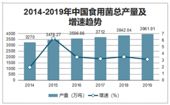 2014-2019年中國食用菌總產(chǎn)量及增速趨勢