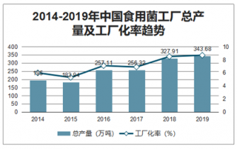 2014-2019年中國食用菌工廠總產(chǎn)量及工廠化率趨勢
