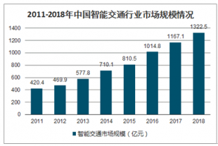 智能交通系統(tǒng)對于提高交通管理效率、緩解交通擁擠、減少環(huán)境污染、確保交通安全起到了非常重要的作用,符合國家建設(shè)“智慧城市”、“綠色城市”和“平安城市”的要求,得到政策面的大力支持。長期來看,我國智能交通系統(tǒng)將在交通運輸?shù)母鱾行業(yè)和環(huán)節(jié)得到更為廣泛的應(yīng)用,由此創(chuàng)造相應(yīng)的社會效益和經(jīng)濟(jì)效益,具有廣闊的發(fā)展前景。2018年我國智能交通行業(yè)市場規(guī)模約1322.5億元,同比2017年的1167.1億元增長了13.32%。