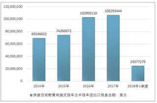 2016年我國供居住或野營用廂式掛車及半掛車進出口貿(mào)易總額102900110美元,2017年進出口貿(mào)易總額106293444美元;2019年1季度進出口貿(mào)易總額24377279美元。