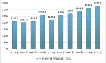 在產(chǎn)業(yè)規(guī)模方面,近年來受行業(yè)產(chǎn)品價格波動、產(chǎn)銷規(guī)模變化等多重因素的影響,我國不銹鋼市場規(guī)模變化較為明顯,2011年我國不銹鋼市場規(guī)模為2121.2億元,2020年產(chǎn)業(yè)規(guī)模達(dá)到3289.2億元。
